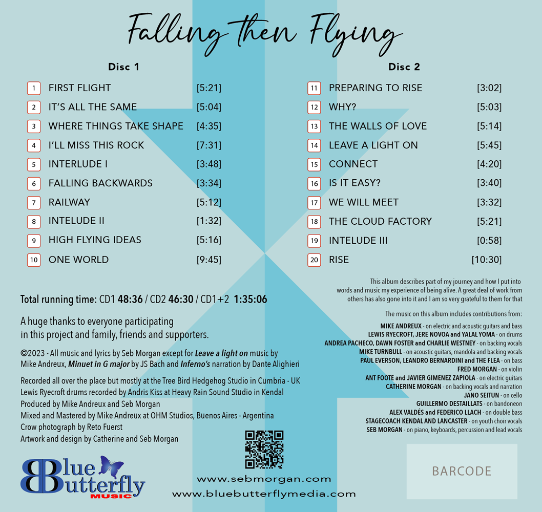 Falling Then Flying is my latest double album. A compilation of 20 tracks that surmises years of my own journey and how I put into words and music my experience of being alive. This album contains contributions from 18 different musicians and artists, and 25 youngsters from a youth choir led by 2 incredible teachers. The music in it is inspired by years of Rock, Pop, Musical Theatre and Classical and Film music. I do hope you enjoy it!