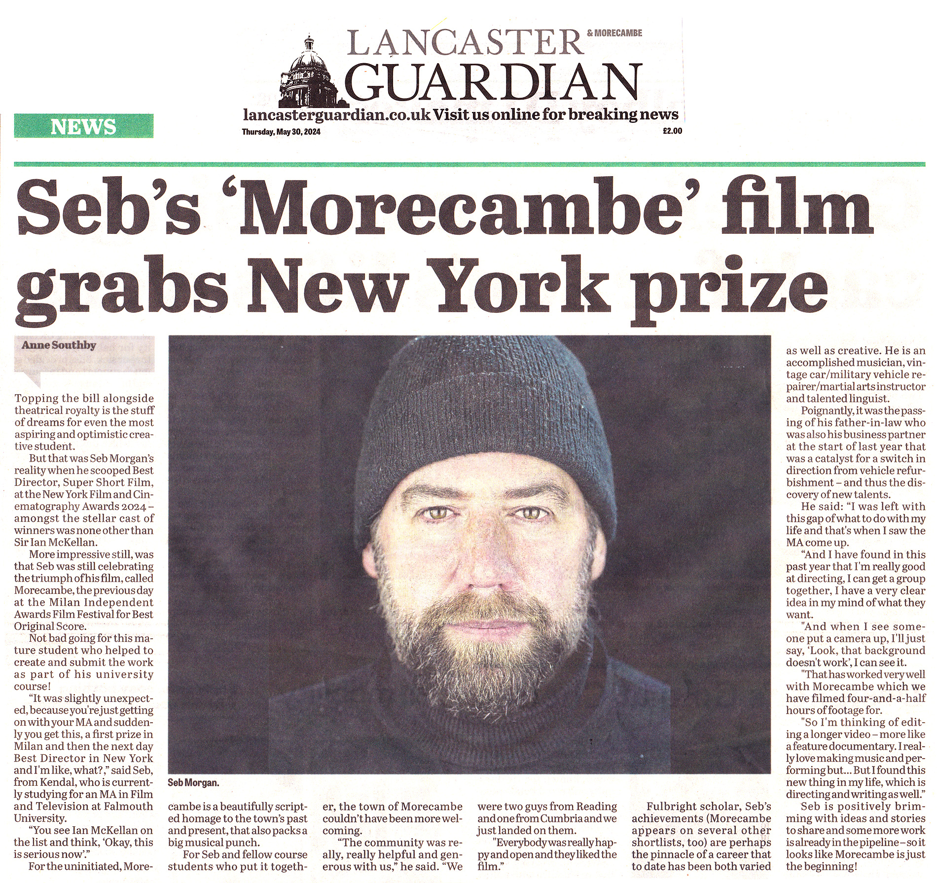 Seb in the Lancaster Guardian after getting 'Best Director' in New york for the film Morecambe